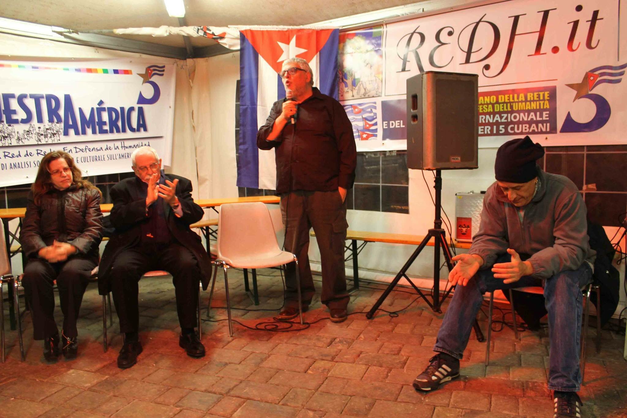 L’incontro ha avuto inizio con gli interventi di Luciano Vasapollo, degli Ambasciatori di Cuba in Italia e presso la Santa Sede, di Rita Martufi, di Nunzio D'erme, anche lui recentemente riportato alla libertà, ai suoi compagni e alle sue lotte. Tutti hanno evidenziato che è stata una battaglia vinta dal popolo cubano che da oltre 50 anni resiste all’infame bloqueo nordamericano e che ha saputo resistere anche a questa provocazione e ingerenza con la prigionia dei propri fratelli; vinta dai 5 compagni e dalle loro famiglie che eroicamente hanno saputo sopportare con forza e grandissima dignità, nel loro compito rivoluzionario, una detenzione feroce; e vinta da tutti i rivoluzionari del mondo che da 16 anni hanno voluto e saputo, anche con momenti molto difficili, tenacemente portare avanti questa battaglia di libertà e di autodeterminazione.