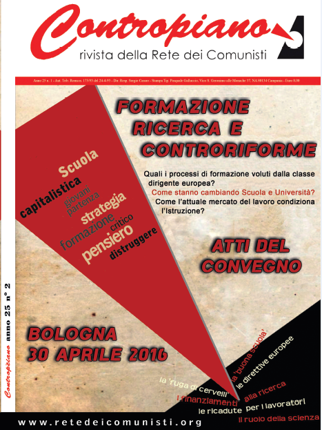 Un’altra indicazione di lotta per una forza comunista è quella di tipo ideologico sulla neutralità della scienza. Se la scienza assurge oggi ad uno degli elementi principali dello sviluppo umano, non possiamo sottrarci ad un’opera di chiarimento sul ruolo della scienza per non lasciare in mano all’avversario di classe un nuovo feticcio ideologico che viene usato per rafforzare la propria egemonia. In ogni società la conoscenza è il prodotto, il riflesso, degli interessi della classe dominante e dunque anche i “prodotti” di questa attività rispecchiano questa matrice, vedi le ricerche fatte dalle multinazionali dell’agricoltura o sulle medicine finalizzate solo ai profitti. Queste nel capitalismo sono le ricerche che si affermano e producono scienza anche a discapito degli interessi sociali generali. Come pure è evidente la prevalenza delle finalità militari in molti campi degli investimenti e della ricerca scientifica. La Rete dei Comunisti da tempo segue questo filone di analisi e di elaborazione perchè la scienza e la tecnologia sono forze produttive che hanno le potenzialità per aprire una prospettiva verso la trasformazione sociale. Su questi terreni abbiamo promosso nel 2008 e 2009 diversi incontri e forum, a Roma con “Pianeta Merce” ed a Pisa con “Crisi e Alternative”, dove le questioni della scienza, dell’ambiente e della tecnologia sono stati affrontati evidenziando contraddizioni e possibilità alla luce comunque del carattere di classe delle conoscenze da queste prodotte.